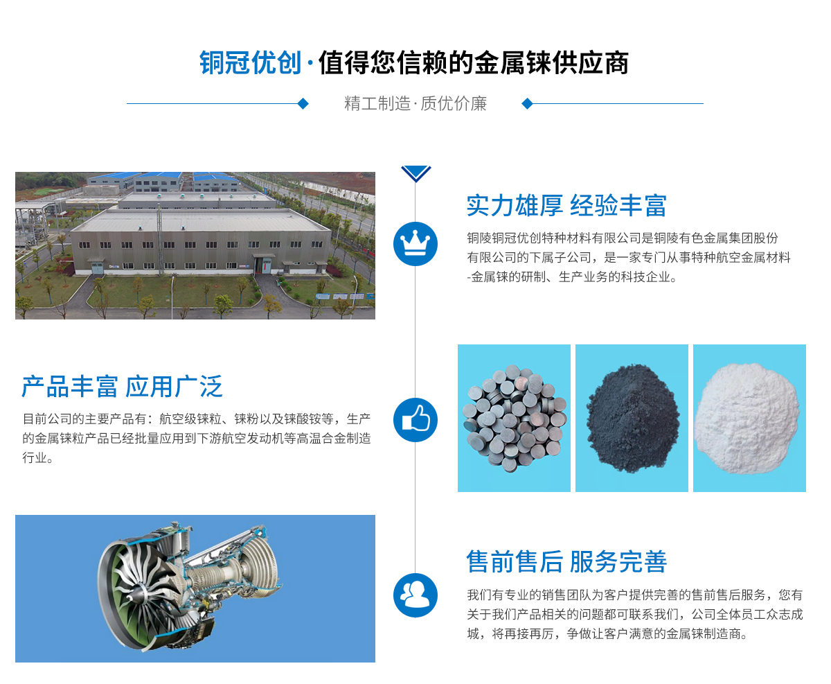 - 銅陵銅冠優創特種材料有限公司是銅陵有色金屬集團股份有限公司的下屬子公司,是一家專門從事特種航空金屬材料-金屬錸的研制、生產業務的科技企業。公司創始于2018年,廠址位于銅陵市經濟技術開發區,一期項目于2019年6月完工并順利投產。截至目前公司的主要產品有:航空級錸粒、高純錸粉以及高純錸酸銨等。 銅冠優創公司錸原料源于銅陵有色集團內供,銅陵有色集團是安徽省國資委控股的國有獨資公司,世界500強企業,世界較大的銅冶煉企業,每年從世界各地進口近 400 萬噸含錸銅精砂,相當于每年從全球收集錸資源 5-8 噸。 銅冠優創公...